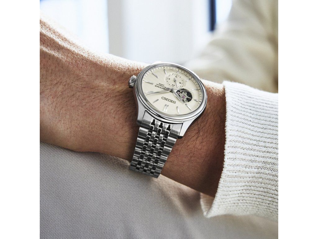 Srdcem řady Presage Classic jsou bohatě strukturované, zakřivené číselníky, které vyjadřují měkkost a poddajnost přírodních textilií, jejichž používání je spjato s japonskou kulturou. Číselník u těchto hodinek s průzorem open-heart vyjadřuje texturu surové hedvábné příze prostřednictvím radiálního vzoru. Svým zakřivením a složitě strukturovaným vzorem zachycují a odrážejí okolní světlo pro vytvoření intenzivnějšího pocitu hloubky a krásy. Vrcholy indexů se zakřivují tak, aby odpovídaly zaoblenému tvaru číselníků, a minutová i sekundová ručka se jemně sklápí směrem k ukazatelům. Pouzdro je vyrobeno s jemnými zakřivenými plochami a dvojité zakřivené safírové sklíčko kopíruje kontury kopulovitého číselníku, což dodává celkovému designu další hloubku. Nově vyvinutý víceřadý náramek s designem inspirovaným 70. lety 20. století poskytuje jemný a příjemný pocit na zápěstí. Články náramku mají ergonomický tvar se zakřiveným horním povrchem a snížením počtu kontaktních bodů kolem zápěstí, což zajišťuje pohodlné nošení a lepší estetiku. Kalibr 6R5J s automatickým nátahem a rezervou chodu 72 hodin můžeme pozorovat skrze průhledné dýnko hodinek i číselník.